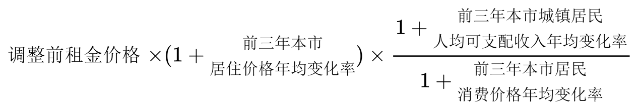 公租房租金价格首次定价原则上按照不超过同地段、同品质房屋市场租金的60%,结合房屋建设运营成本和不同保障对象收入水平确定。综合考虑经济社会发展水平和群众承受能力,根据本市城镇居民人均可支配收入、居民消费价格指数和居住价格指数变化均值,每3年动态调整一次。租金价格调整算法如下: